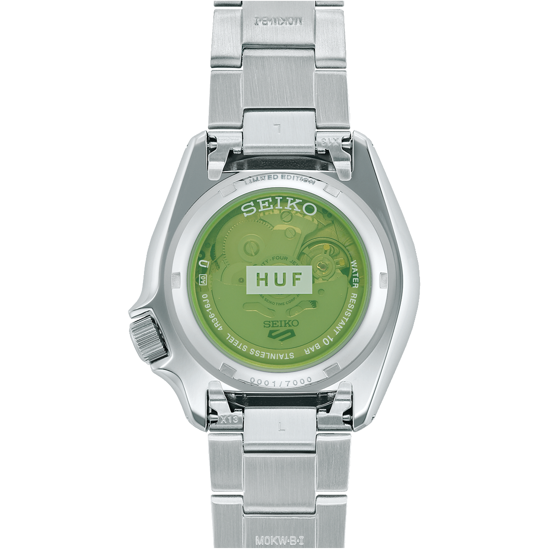 Espectacular esta serie limitada de seiko en colaboración con el famoso skater Keith Hufnagel y fundador de la famosa firma de ropa que lleva su nombre HUF.Una serie limitada a tan solo 7000 piezas mundial,que se presenta en un muy especial set con una caja de aluminio matizado con una especial sedigrafia que hace mención HUF y la numeración de seiko,este Seiko 5 sport skx x HUF esta totalmente personalizado con vivos colores que nos trae a la mente el famoso seiko time sonar y a su vez colores y temática de la firma de ropa.